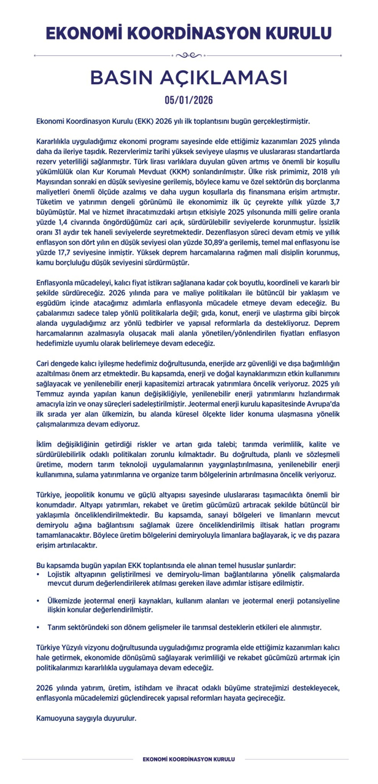 ANKARA (İGFA) - Cumhurbaşkanlığı Külliyesi'nde bugün gerçekleştirilen Ekonomi Koordinasyon Kurulu (EKK) toplantısı, 2026 yılının ilk toplantısı olarak kayıtlara geçti.