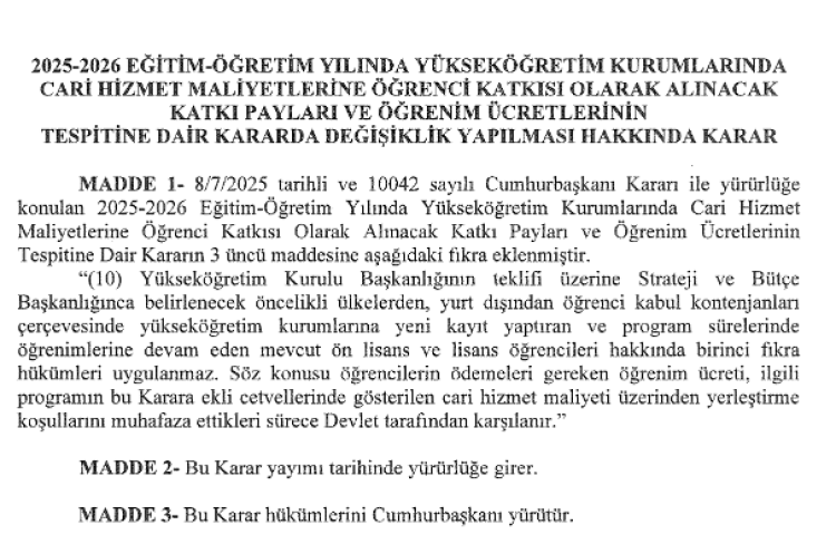 Cumhurbaşkanı Recep Tayyip Erdoğan, 2025-2026 Eğitim-Öğretim Yılında Yükseköğretim Kurumlarında Katkı Payları ve Öğrenim Ücretlerine dair 10042 sayılı Karar'da değişiklik yaptı. Stratejik ülkelerden gelen yabancı öğrencilerin öğrenim ücretleri, program sürelerince devlet tarafından karşılanacak.