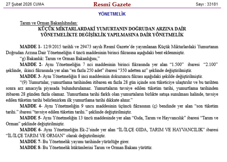 Tarım ve Orman Bakanlığı, küçük miktarlardaki yumurtanın doğrudan arzına ilişkin yönetmelikte değişikliğe gitti. Günlük satış limiti artırılırken, tüketim süresi ve terminolojide de düzenlemeler yapıldı.
