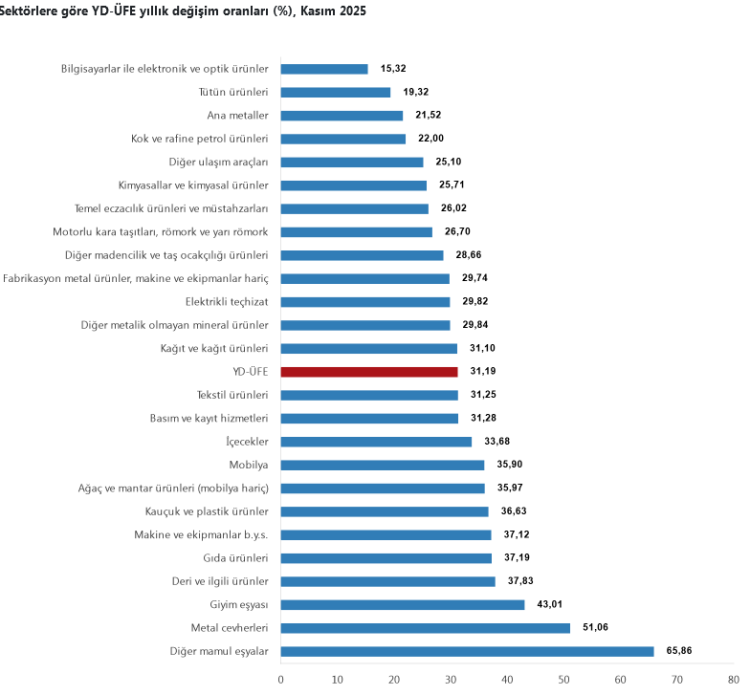 TÜİK'in açıkladığı Kasım ayı verilerine göre Yurt Dışı Üretici Fiyat Endeksi aylık yüzde 1,02, yıllık yüzde 31,19 artış gösterdi. En yüksek yıllık artış madencilik ve taş ocakçılığı sektöründe kaydedildi.